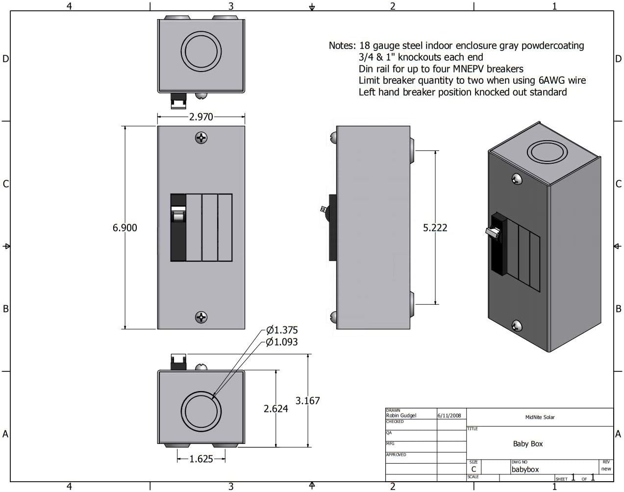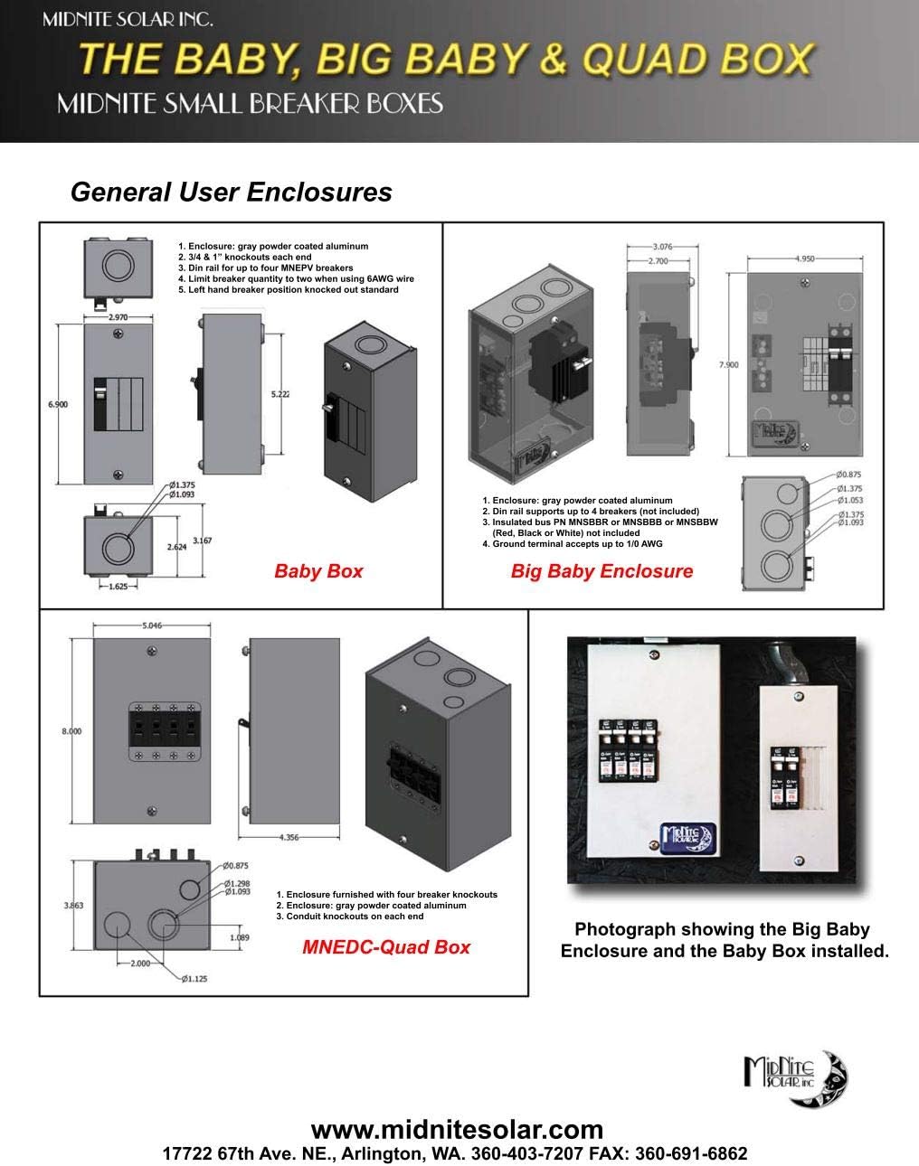 General Use Powder Coated Aluminum Enclosure For Retrofits, Small Inverter Disconnect, PV Disconnect, AC Or DC Distribution. Used All Around The World. 3/4 & 1" Knockouts Each End. Accepts Up To 4 Din Mount Breakers From 1 To 63 Amps.