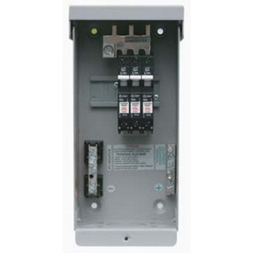 Gray aluminum type NEMA 3R rainproof enclosure with insulating dead front.